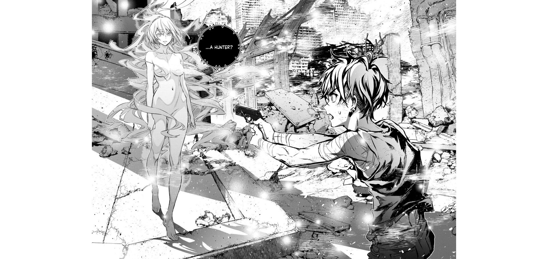 This manga, and its parent LN story, follows the journey of Akira, an orphan from the slums located at the edge between one of the remaining bastions of civilization and the rest of the dilapidated world. Humanity had reached its pinnacle with technology and bioengineering, however, said bio enhancement led to the near extinction of humanity. The world is now roamed by bio-techno- enhanced animals that stand guard over the old world ruins, full of technology and items that can make one tremendously wealthy in current society. Brave individuals, called hunters, set out into the old world for these relics in the hopes of riches and power.