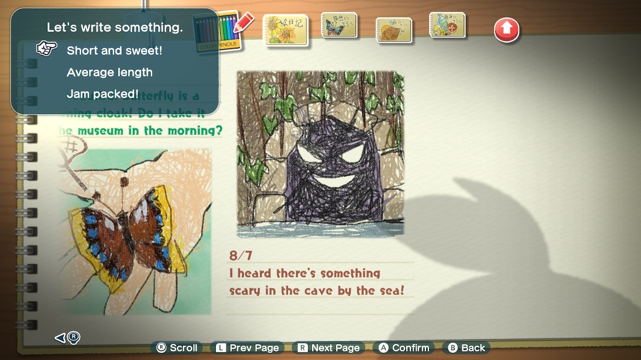 The game is an open-world adventure where you control Satoru and do all kinds of stuff. See, your ultimate goal is to study whatever you want for your summer research project, which all the elementary school kids in town find themselves doing for summer homework. To complete this project, Satoru is provided a study set, which includes a sketchbook and colored pencils for making a picture journal to document his adventures. Throughout the game you can either activate the sketchbook documenting whenever you want during the day, or let it happen automatically when you go to bed each night. Either way the pictures appear on their own, but you can choose how in depth the text goes about the latest events and choose a stamp for the corner of each picture. Satoru draws scenes for events he finds significant that occurred during the day and also all fish and bugs he catches are documented when you newly catch one. Fish, you never really know what you’re catching before reeling them in. You can kinda guess based on the shape or size of their shadows, but otherwise it’s a bit of a mystery. Bugs, you’ll know if they’re brand new ones you haven’t caught yet because new bugs will have white circles around them, and old ones you’ve caught previously won’t.